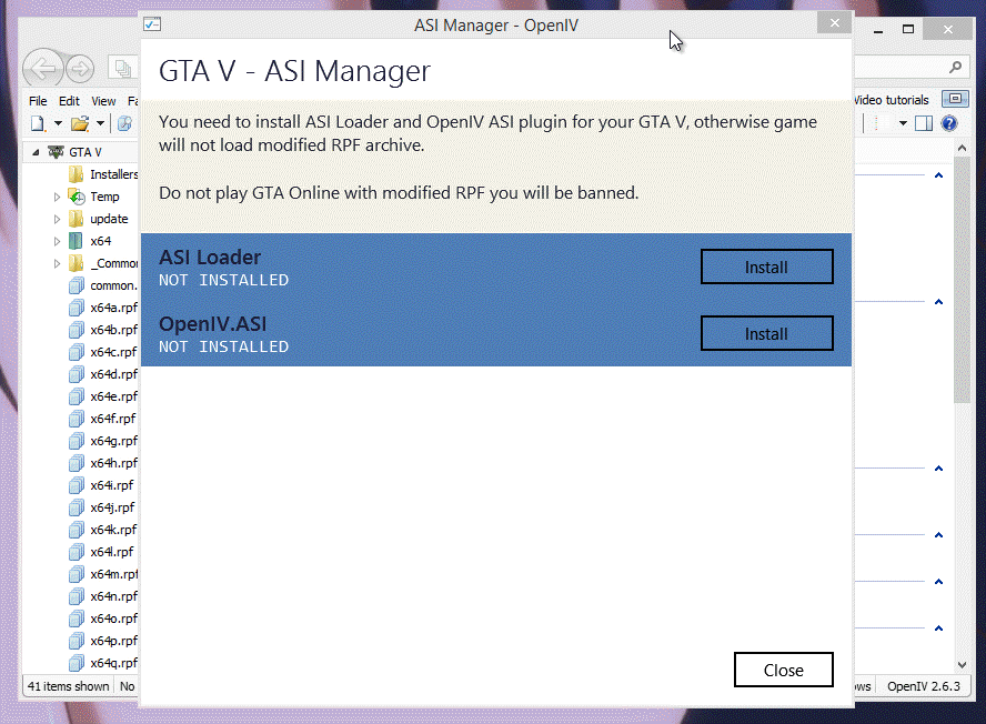 Некоторые модификации, в основном, графические, требуют использования специальной вкладки редактора Open IV ASI Manager. Пользователь должен выбрать вкладку инструментов и найти соответствующие плагины. Затем придётся отдельно установить каждый из них – а, если нужно снять ограничения камеры, здесь же добавить модуль openCamera.
